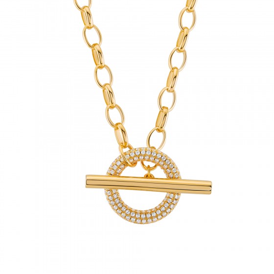 Bold Daily Travinca Chain Necklace in 925 sterling silver with gold plating. It features a zirconia-set circle and a toggle clasp. A statement piece designed to accompany you in your everyday life.Details